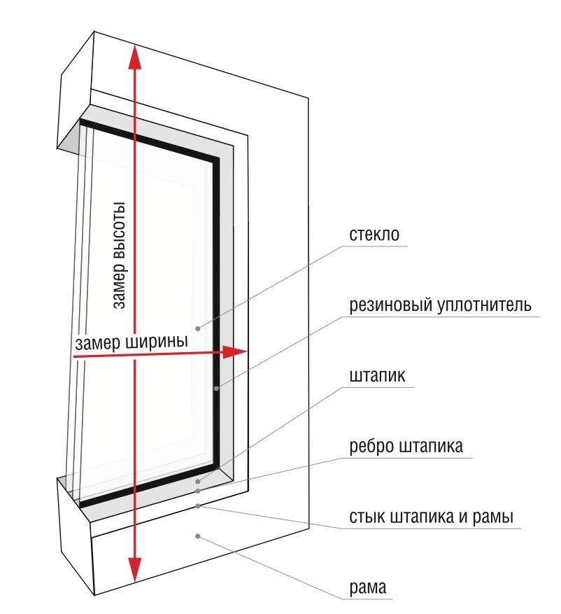 • Измерьте высоту по стыкам штапика и рамы (замер выполнять по правому или левому краю рамы).