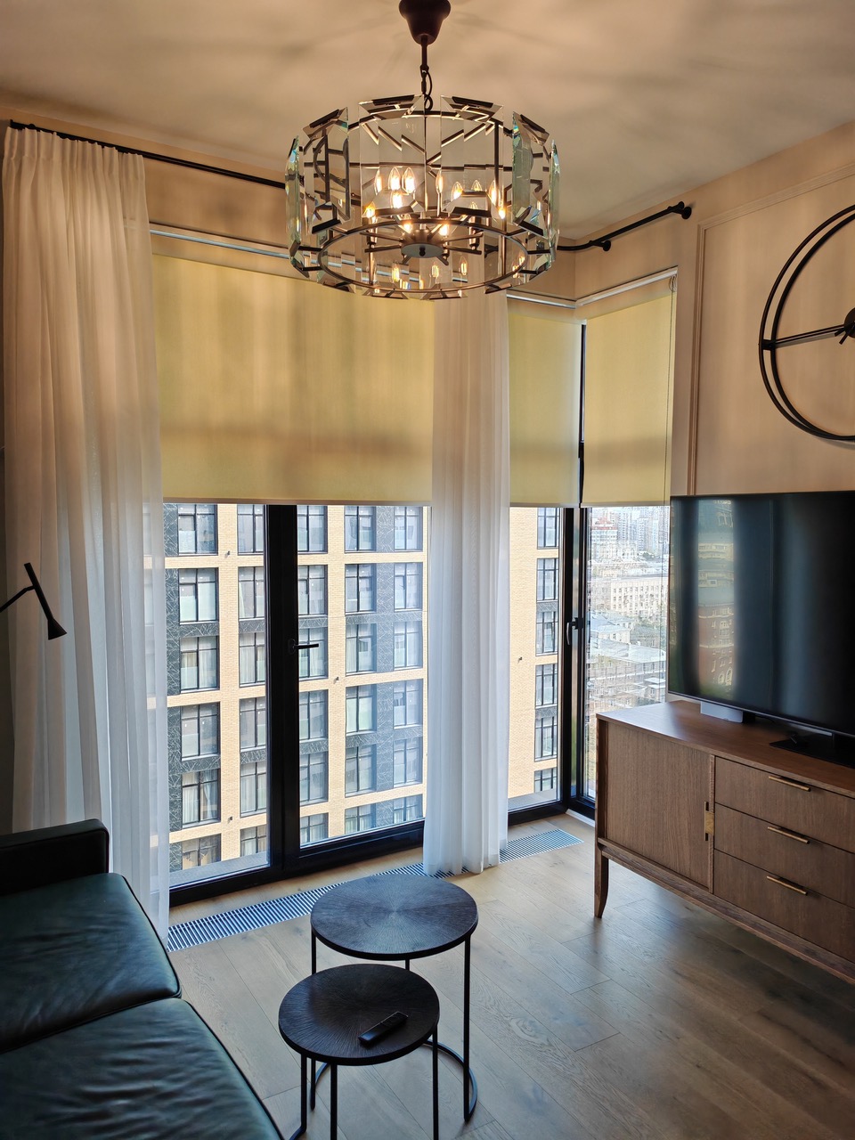 Сюда же можно отнести рольшторы «день-ночь» (Zebra). Это настоящая находка для панорамных окон. Чередование прозрачных и плотных полос позволяет одним движением регулировать уровень освещенности от яркого до приватного, создавая мягкий рассеянный свет. Это одно из самых удобных и востребованных решений.