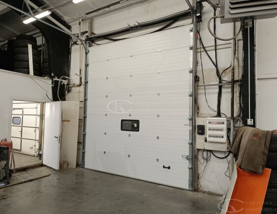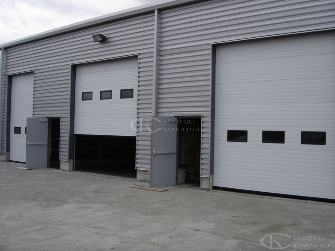 Выдерживают большую влажность и интенсивную эксплуатацию, комплектуются электроприводом. Полотно собирают из сэндвич-панелей, покрытых специальным составом для защиты от коррозии. Все элементы конструкции (ролики, петли, направляющие) износостойкие, стыки и торцы покрываются герметиками и силиконом, что предотвращает попадание влаги внутрь. Секционные подъемные ворота оснащаются калитками и окнами.