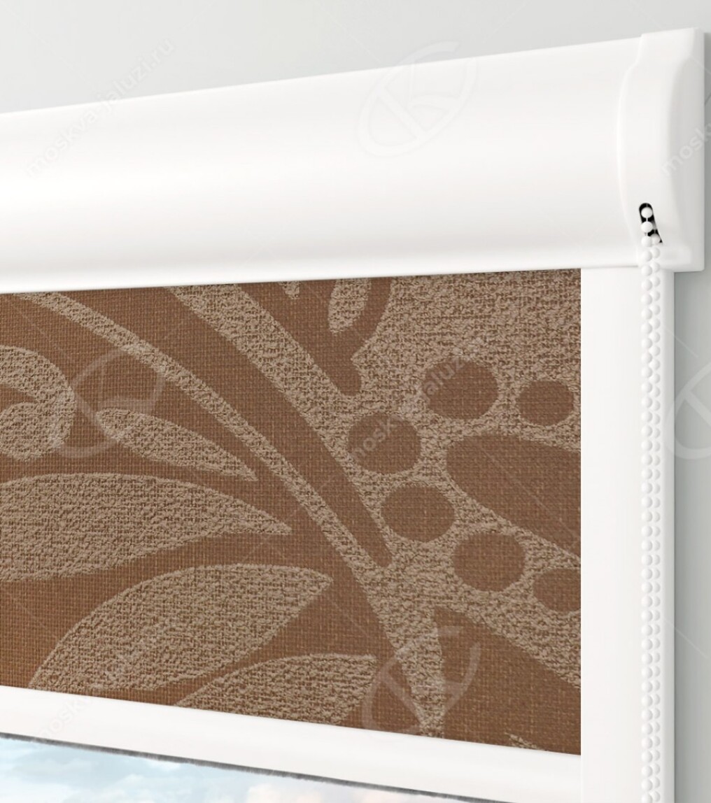 Кассетные рулонные шторы Уни-2 – Версаль шоколад – хороший выбор для управления освещенностью комнаты: это оптимальное соотношение цены и качества. Кассетные рулонные жалюзи легко устанавливаются и управляются: для подъёма и опускания полотна предусмотрена тканевая цепочка. При открытом положении ткань размещается в пластиковом коробе, при закрывании она перемещается по направляющим.