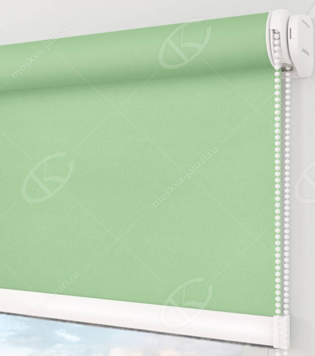 Рулонные шторы Мини – Респект блэкаут зеленый — одна из самых распространенных систем управления освещенностью комнаты. Полотно рулонных штор легко поднимается и опускается, для управления может использоваться цепочка из металла или пластика. Величина вала, на который наматывается полотно, будет зависеть от его длины и ширины, это нужно учитывать при подборе подходящей рулонной шторы.