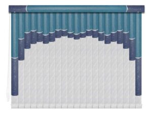 Если в грувер вставить несколько ламелей из разных материалов, получатся мультифактурные вертикальные жалюзи. Обычно внизу полотна используют тонкую ткань с пропиткой для имитации тюля, а сверху — пластик. Между собой ламели соединяют тонкими лентами, а поверх соединения крепят декоративные вставки золотистого или серебристого цвета. Ламели крепятся к декоративному карнизу. Монтировать систему можно на потолок или стену. Управление ламелями (их поворот, открывание и закрывание) происходит при помощи специальных шнуров.